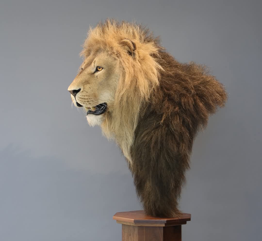 This African Lion Pedestal Mount represents the pinnacle of large-cat taxidermy. Professionally preserved to museum standards, the mount features a magnificent, full-bodied mane that cascades down the chest and shoulders, showcasing incredible volume and natural color depth. The facial detailing is world-class, capturing the subtle muscle tension and noble gaze of a mature pride leader.